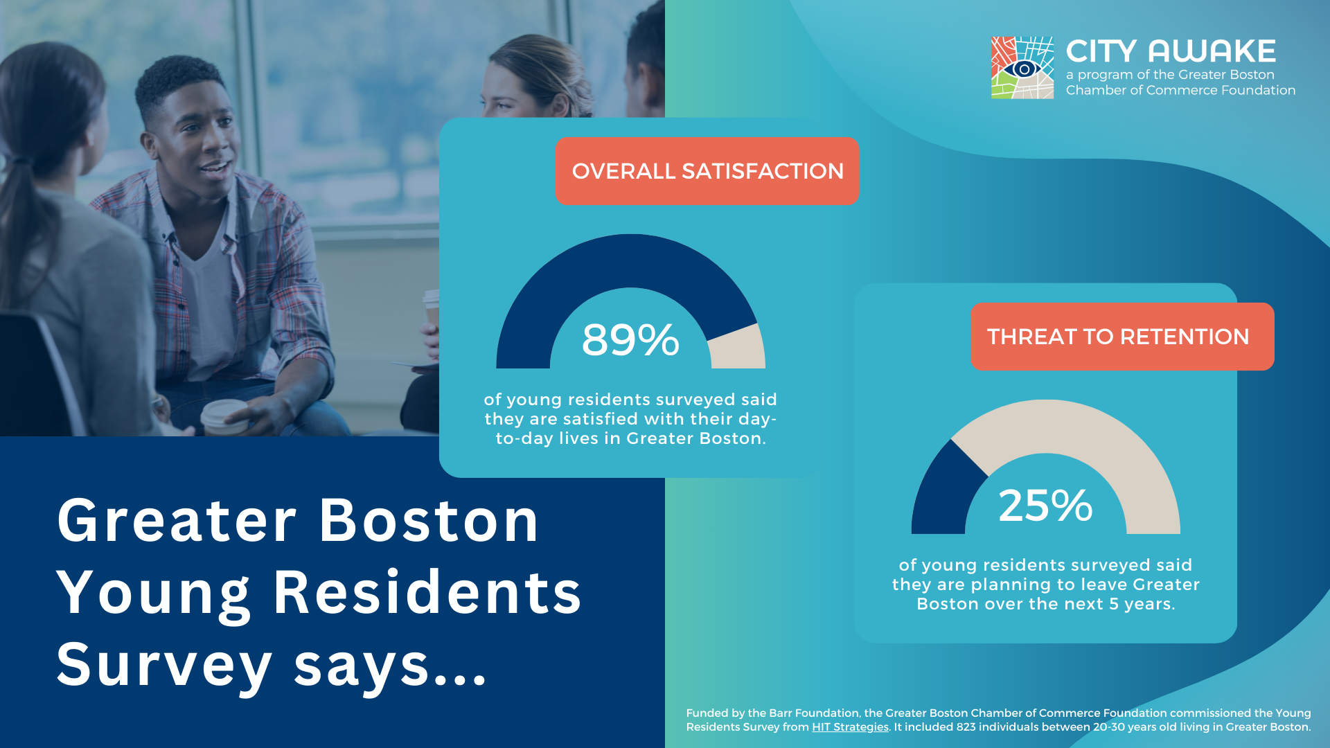 City Awake and the Greater Boston Chamber of Commerce Foundation commissioned a survey from HIT Strategies in November and December 2023 targeting over 800 residents aged 20-30 within the Greater Boston area (including Essex, Middlesex, Norfolk, Plymouth, and Suffolk counties). The survey’s main objective was to gain insight into the attitudes and perspectives of young residents towards the region, alongside understanding their core values and priorities professionally and personally.