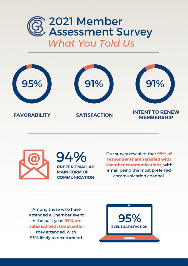 In March/April, we partnered with KRC Research to conduct a survey of our members and stakeholders in order to assess brand health and sentiment towards the Chamber. We were pleased to discover that 91% of survey respondents said they are satisfied with their Chamber membership, and we hope to continue growing this number and delivering the best possible membership experiences to every organization in our community.